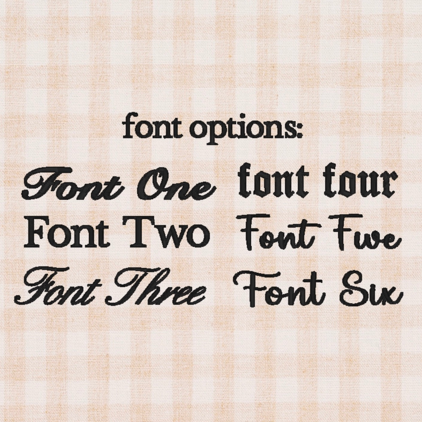 Thread color options are in the last photo of listing. I do have some others that are not listed in the chart so please reach out if you are wanting another color!